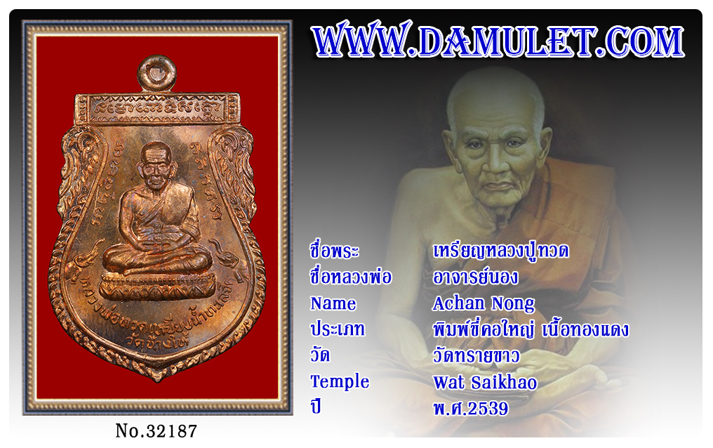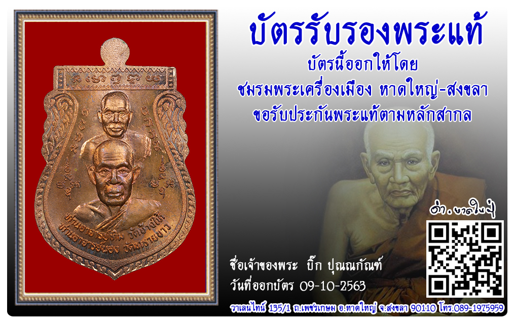 เหรียญหลวงปู่ทวด อาจารย์นอง วัดทรายขาว พ.ศ.2539 2563 09 ต.ค. 2020 616 share tweet share ชื่อพระ : เหรียญหลวงปู่ทวดชื่อหลวงพ่อ : อาจารย์นองประเภท : พิมพ์ขี่คอใหญ่ เนื้อทองแดงวัด-ปี : วัดทรายขาว พ.ศ.2539รหัส : No.32187วันที่ออกบัตร : 09-10-2563ชื่อเจ้าของพระ : บิ๊ก ปุณณกัณฑ์