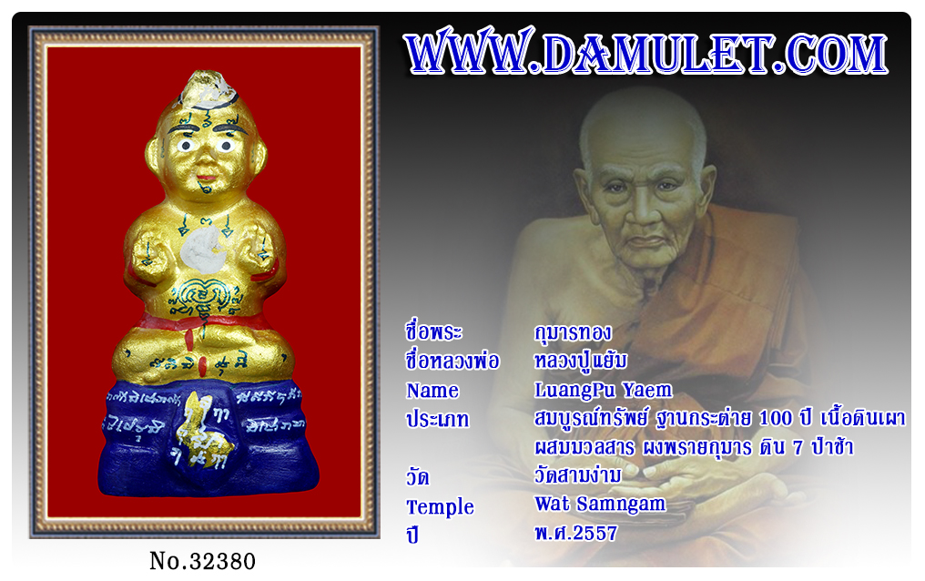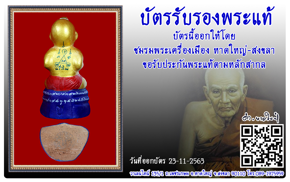 กุมารทอง หลวงปู่แย้ม วัดสามง่าม พ.ศ.2557 2563 23 พ.ย. 2020 320 share tweet share ชื่อพระ : กุมารทองชื่อหลวงพ่อ : หลวงปู่แย้มประเภท : สมบูรณ์ทรัพย์ ฐานกระต่าย 100 ปี เนื้อดินเผา ผสมมวลสาร ผงพรายกุมาร ดิน 7 ป่าช้าวัด-ปี : วัดสามง่าม พ.ศ.2557รหัส : No.32380วันที่ออกบัตร : 23-11-2563