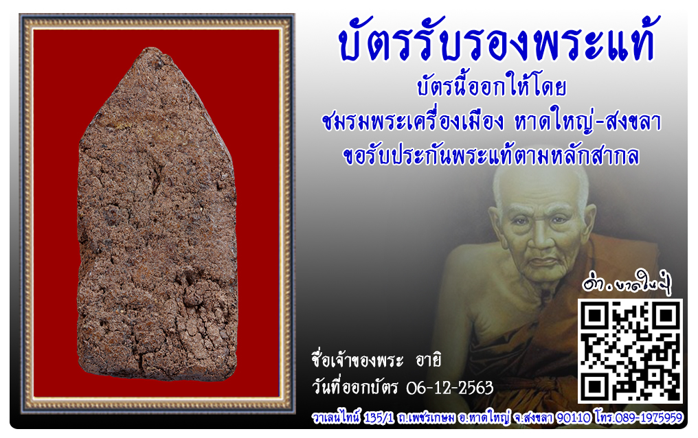 พระขุนแผนสะดุ้งกลับ วัดหลักห้า พ.ศ.2503 2563 06 ธ.ค. 2020 286 share tweet share ชื่อพระ : พระขุนแผนสะดุ้งกลับประเภท : รุ่นแรก พิมพ์ใหญ่วัด-ปี : วัดหลักห้า พ.ศ.2503รหัส : No.32437วันที่ออกบัตร : 06-12-2563ชื่อเจ้าของพระ : อายิ