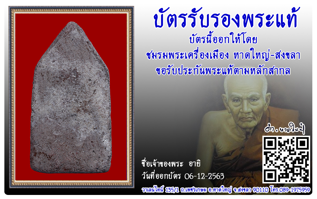 พระขุนแผนสะดุ้งกลับ วัดหลักห้า พ.ศ.2503 2563 06 ธ.ค. 2020 308 share tweet share ชื่อพระ : พระขุนแผนสะดุ้งกลับประเภท : รุ่นแรก พิมพ์ใหญ่วัด-ปี : วัดหลักห้า พ.ศ.2503รหัส : No.32444วันที่ออกบัตร : 06-12-2563ชื่อเจ้าของพระ : อายิ