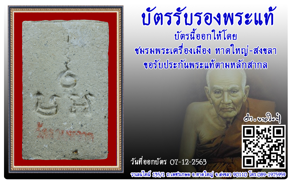 พระสมเด็จ หลวงพ่อชื่น วัดควนหวาน พ.ศ.2505 2563 07 ธ.ค. 2020 269 share tweet share ชื่อพระ : พระสมเด็จชื่อหลวงพ่อ : หลวงพ่อชื่นประเภท : เนื้อผงพุทธคุณวัด-ปี : วัดควนหวาน พ.ศ.2505รหัส : No.32449วันที่ออกบัตร : 07-12-2563