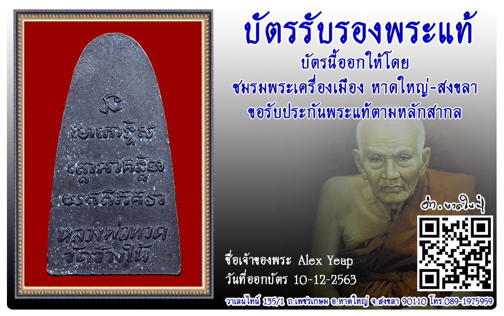 หลวงปู่ทวด วัดช้างให้ พ.ศ.2505 2563 10 ธ.ค. 2020 344 share tweet share ชื่อพระ : หลวงปู่ทวดประเภท : หลังหนังสือ พิมพ์เล็ก บล๊อค ว ตันวัด-ปี : วัดช้างให้ พ.ศ.2505รหัส : No.32468วันที่ออกบัตร : 10-12-2563ชื่อเจ้าของพระ : Alex Yeap