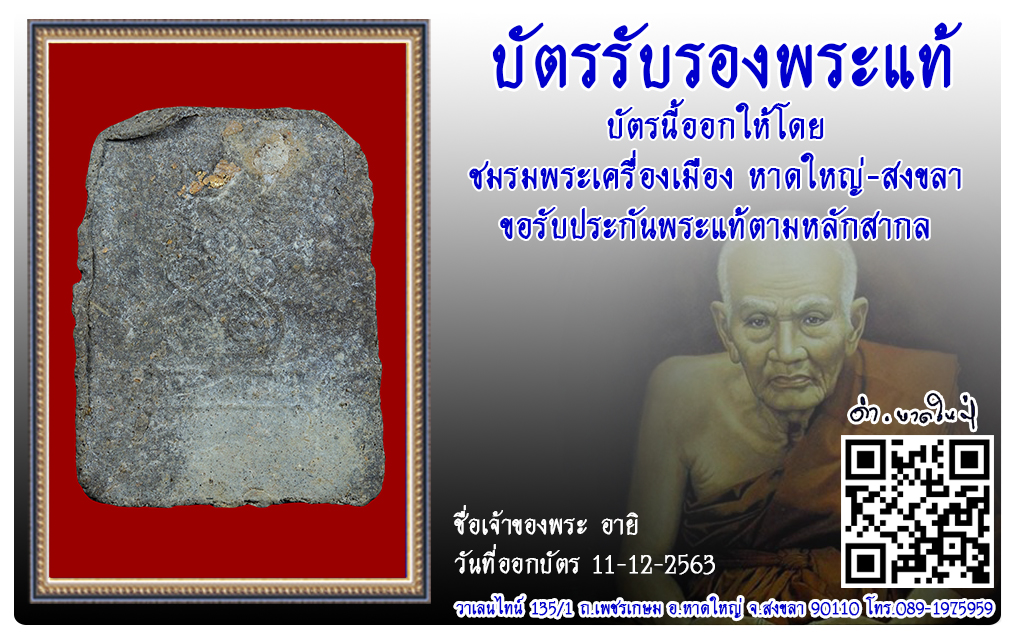 พระสมเด็จทรงสิงห์ อาจารย์ชุม ไชยคีรี ออกวัดกลาง จ.สงขลา พ.ศ.2506 2563 11 ธ.ค. 2020 1048 share tweet share ชื่อพระ : พระสมเด็จทรงสิงห์ชื่อหลวงพ่อ : อาจารย์ชุม ไชยคีรีประเภท : เนื้อผงผสมว่านวัด-ปี : ออก วัดกลาง จ.สงขลา พ.ศ.2506รหัส : No.32494วันที่ออกบัตร : 11-12-2563ชื่อเจ้าของพระ : อายิ