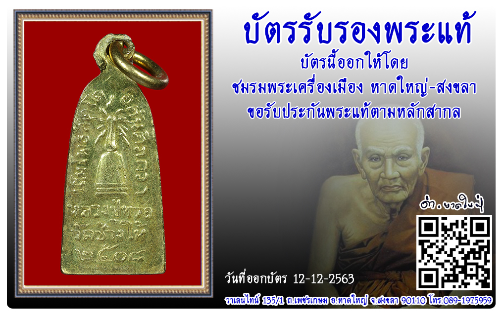 หลวงปู่ทวด วัดช้างให้ พ.ศ.2508 2563 12 ธ.ค. 2020 353 share tweet share ชื่อพระ : หลวงปู่ทวดประเภท : รุ่นทะเลซุง พิมพ์เล็กวัด-ปี : วัดช้างให้ พ.ศ.2508รหัส : No.32515วันที่ออกบัตร : 12-12-2563