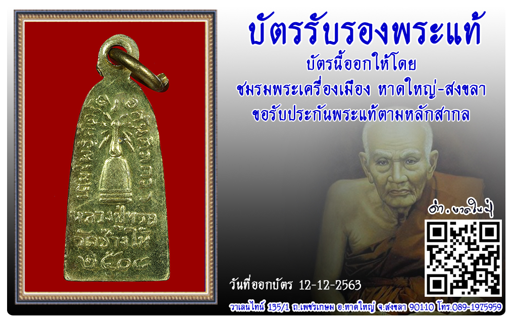 หลวงปู่ทวด วัดช้างให้ พ.ศ.2508 2563 12 ธ.ค. 2020 365 share tweet share ชื่อพระ : หลวงปู่ทวดประเภท : รุ่นทะเลซุง พิมพ์เล็กวัด-ปี : วัดช้างให้ พ.ศ.2508รหัส : No.32517วันที่ออกบัตร : 12-12-2563