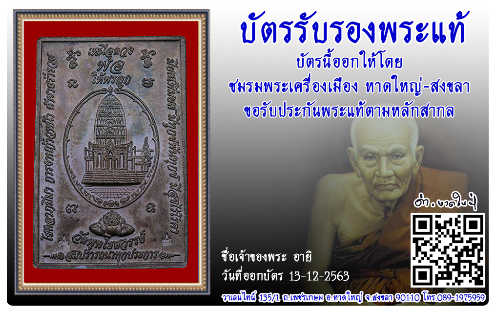 เหรียญจตุคามรามเทพ วัดพุทไธศวรรย์ พ.ศ.2549 2563 13 ธ.ค. 2020 580 share tweet share ชื่อพระ : เหรียญจตุคามรามเทพประเภท : รุ่นเหนือดวง เนื้อทองแดงวัด-ปี : วัดพุทไธศวรรย์ พ.ศ.2549รหัส : No.32520วันที่ออกบัตร : 13-12-2563ชื่อเจ้าของพระ : อายิ
