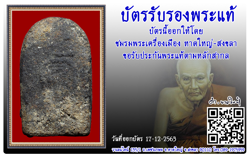 หลวงพ่อทวดหัวเขาแดง ศาลเจ้าทวดเขาแดง จ.สงขลา พ.ศ.2505 2563 17 ธ.ค. 2020 828 share tweet share ชื่อพระ : หลวงพ่อทวดหัวเขาแดงประเภท : รุ่นแรก เนื้อว่านวัด-ปี : ศาลเจ้าทวดเขาแดง จ.สงขลา พ.ศ.2505รหัส : No.32525วันที่ออกบัตร : 17-12-256