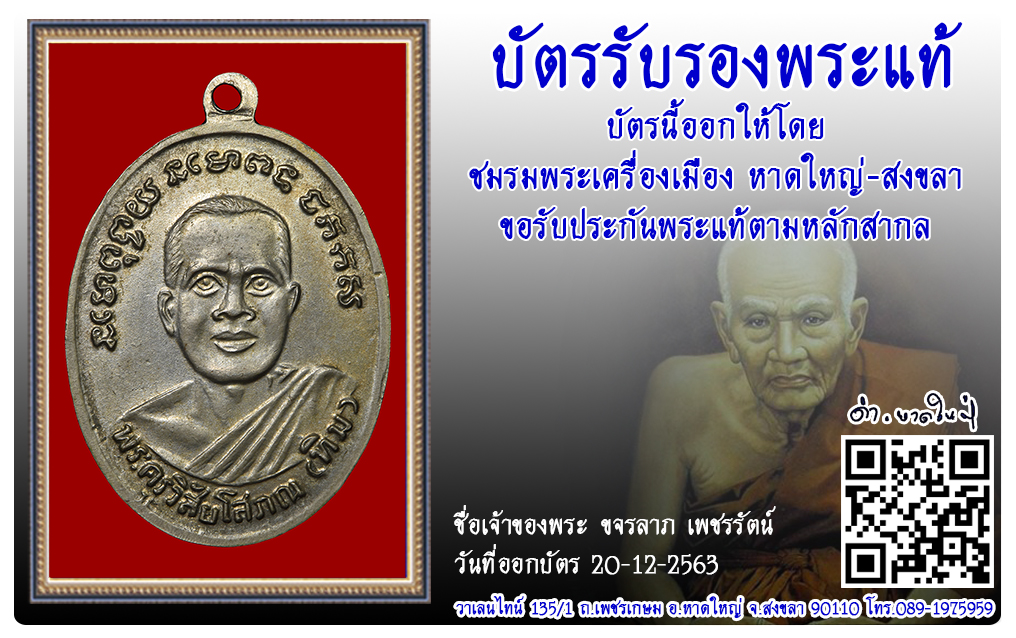 เหรียญหลวงปู่ทวด วัดช้างให้ พ.ศ.2504 2563 20 ธ.ค. 2020 444 share tweet share ชื่อพระ : เหรียญหลวงปู่ทวดประเภท : พิมพ์ไข่ปลาเล็ก รุ่น 4 เนื้ออัลปาก้าวัด-ปี : วัดช้างให้ พ.ศ.2504รหัส : No.32532วันที่ออกบัตร : 20-12-2563ชื่อเจ้าของพระ : ขจรลาภ เพชรรัตน์