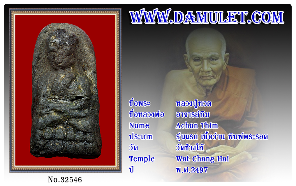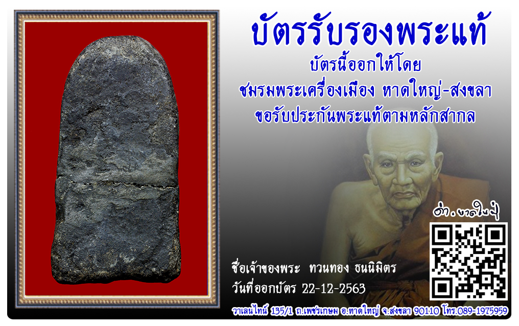 หลวงปู่ทวด อาจารย์ทิม วัดช้างให้ พ.ศ.2497 2563 22 ธ.ค. 2020 557 share tweet share ชื่อพระ : หลวงปู่ทวดชื่อหลวงพ่อ : อาจารย์ทิมประเภท : รุ่นแรก เนื้อว่าน พิมพ์พระรอดวัด-ปี : วัดช้างให้ พ.ศ.2497รหัส : No.32546วันที่ออกบัตร : 22-12-2563ชื่อเจ้าของพระ : ทวนทอง ธนนิมิตร