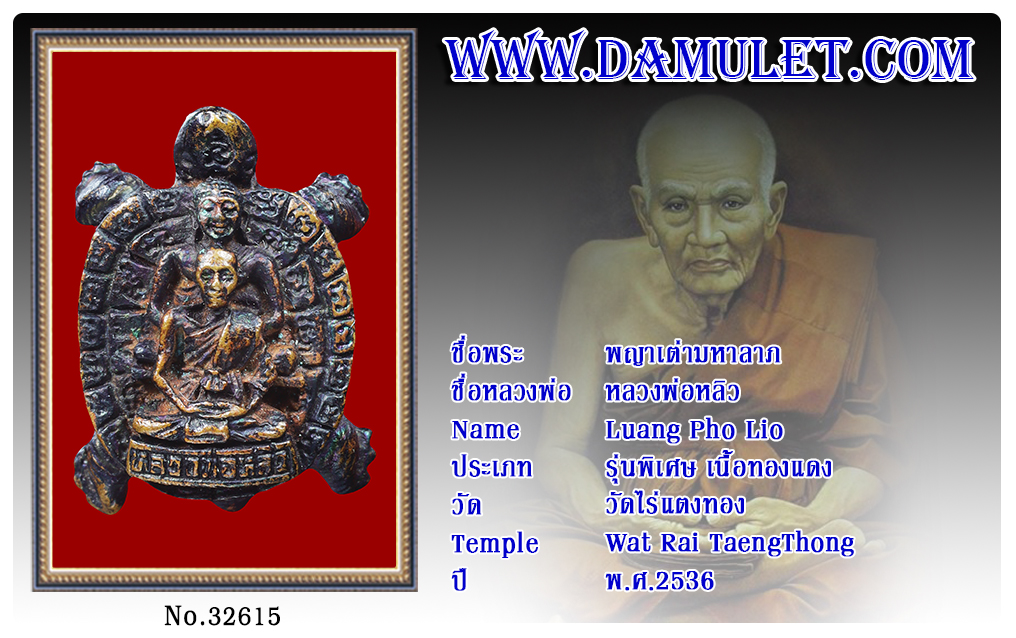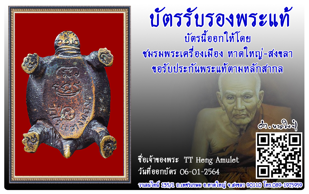 พญาเต่ามหาลาภ หลวงพ่อหลิว วัดไร่แตงทอง พ.ศ.2536 2564 06 ม.ค. 2021 802 share tweet share ชื่อพระ : พญาเต่ามหาลาภชื่อหลวงพ่อ : หลวงพ่อหลิวประเภท : รุ่นพิเศษ เนื้อทองแดงวัด-ปี : วัดไร่แตงทอง พ.ศ.2536รหัส : No.32615วันที่ออกบัตร : 06-01-2564ชื่อเจ้าของพระ : TT Heng Amulet