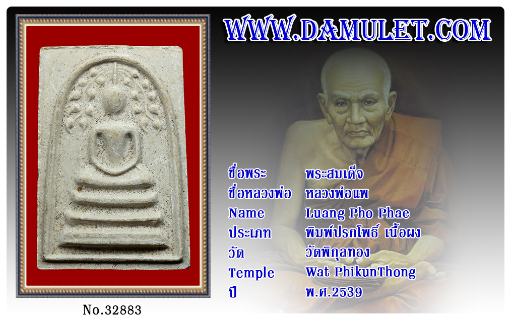 พระสมเด็จ หลวงพ่อแพ วัดพิกุลทอง พ.ศ.2539 2564 01 ก.พ. 2021 331 share tweet share ชื่อพระ : พระสมเด็จชื่อหลวงพ่อ หลวงพ่อแพประเภท : พิมพ์ปรกโพธิ์ เนื้อผงวัด-ปี : วัดพิกุลทอง พ.ศ.2539รหัส : No.32883