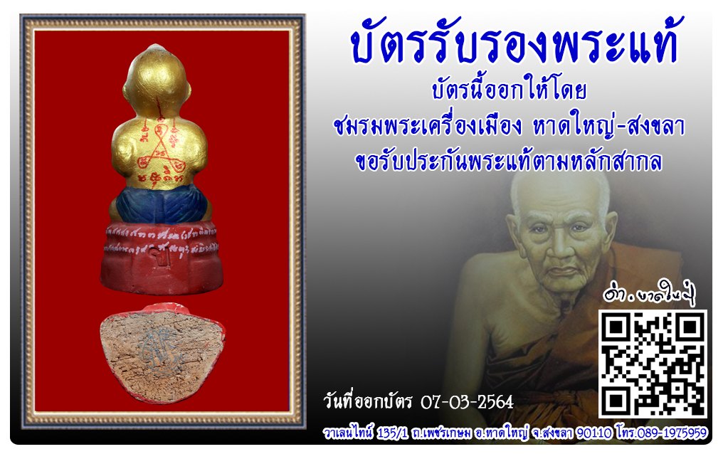 กุมารทอง หลวงปู่แย้ม วัดสามง่าม พ.ศ.2557 2564 07 มี.ค. 2021 333 share tweet share ชื่อพระ : กุมารทองชื่อหลวงพ่อ : หลวงปู่แย้มประเภท : รุ่นสมบูรณ์ทรัพย์ ฐานกระต่าย 100 ปี เนื้อดินเผา ผสมมวลสาร ผงพรายกุมาร ดิน 7 ป่าช้าวัด-ปี : วัดสามง่าม พ.ศ.2557รหัส : No.33245วันที่ออกบัตร : 07-03-64