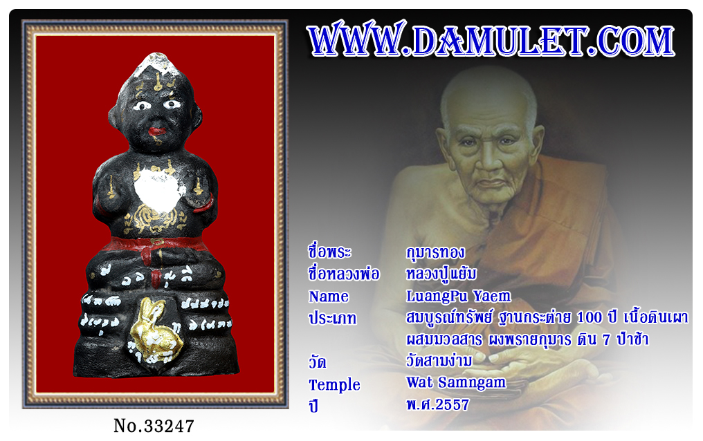 กุมารทอง หลวงปู่แย้ม วัดสามง่าม พ.ศ.2557 2564 07 มี.ค. 2021 512 share tweet share ชื่อพระ : กุมารทองชื่อหลวงพ่อ : หลวงปู่แย้มประเภท : รุ่นสมบูรณ์ทรัพย์ ฐานกระต่าย 100 ปี เนื้อดินเผา ผสมมวลสาร ผงพรายกุมาร ดิน 7 ป่าช้าวัด-ปี : วัดสามง่าม พ.ศ.2557รหัส : No.33247วันที่ออกบัตร : 07-03-64