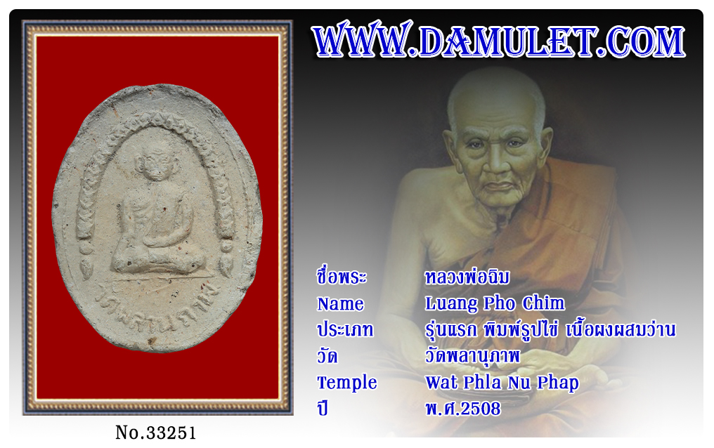 หลวงพ่อฉิม วัดพลานุภาพ พ.ศ.2508 2564 08 มี.ค. 2021 1132 share tweet share ชื่อพระ : หลวงพ่อฉิมประเภท : รุ่นแรก พิมพ์รูปไข่ เนื้อผงผสมว่านวัด-ปี : วัดพลานุภาพ พ.ศ.2508รหัส : No.33251วันที่ออกบัตร : 08-03-64ชื่อเจ้าของพระ : TT Heng Amulet