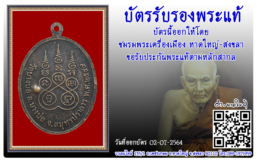 เหรียญหลวงพ่อชาญ วัดบางบ่อ พ.ศ.2549 2564 03 ก.ค. 2021 352 share tweet share ชื่อพระ : เหรียญหลวงพ่อชาญประเภท : ที่ระลึกอายุ 92 ปี เนื้อทองแดงวัด-ปี : วัดบางบ่อ พ.ศ.2549รหัส : No.35713วันที่ออกบัตร : 02-07-64