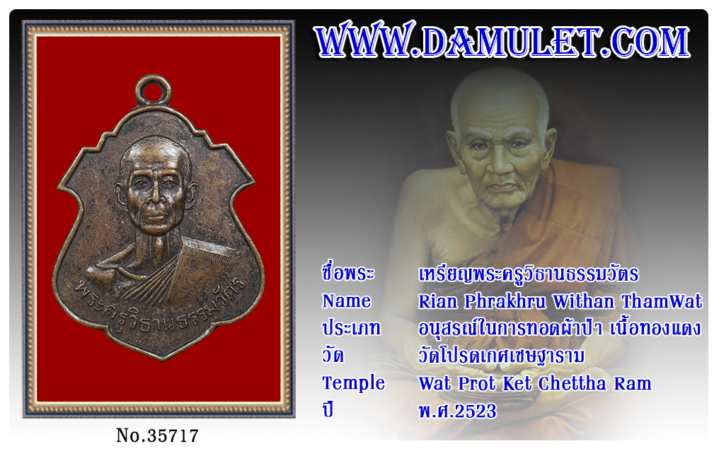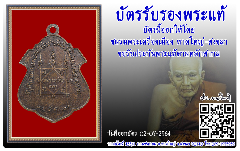 เหรียญพระครูวิธานธรรมวัตร วัดโปรดเกศเชษฐาราม พ.ศ.2523 2564 03 ก.ค. 2021 536 share tweet share ชื่อพระ : เหรียญพระครูวิธานธรรมวัตรประเภท : อนุสรณ์ในการทอดผ้าป่า เนื้อทองแดงวัด-ปี : วัดโปรดเกศเชษฐาราม พ.ศ.2523รหัส : No.35717วันที่ออกบัตร : 02-07-64