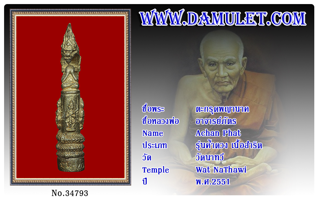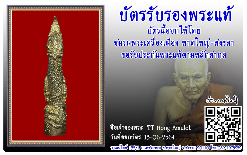 ตะกรุดพญานาค อาจารย์ภัตร วัดนาทวี พ.ศ.2551 2564 08 ก.ค. 2021 256 share tweet share ชื่อพระ : ตะกรุดพญานาคชื่อหลวงพ่อ : อาจารย์ภัตรประเภท : รุ่นค้ำดวง เนื้อสำริดวัด-ปี : วัดนาทวี พ.ศ.2551รหัส : No.34793วันที่ออกบัตร : 13-06-64ชื่อเจ้าของพระ : TT Heng Amulet