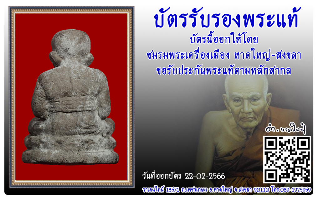 หลวงปู่ทวด วัดสะบ้าย้อย พ.ศ.2539 บัตรรับรองพระแท้ 23 ก.พ. 2023 184 share tweet share ชื่อพระ : หลวงปู่ทวดประเภท : รุ่นเสินเจิ้น เนื้อว่านวัด : วัดสะบ้าย้อย พ.ศ.2539รหัส : No.42547วันที่ออกบัตร : 22-02-2566