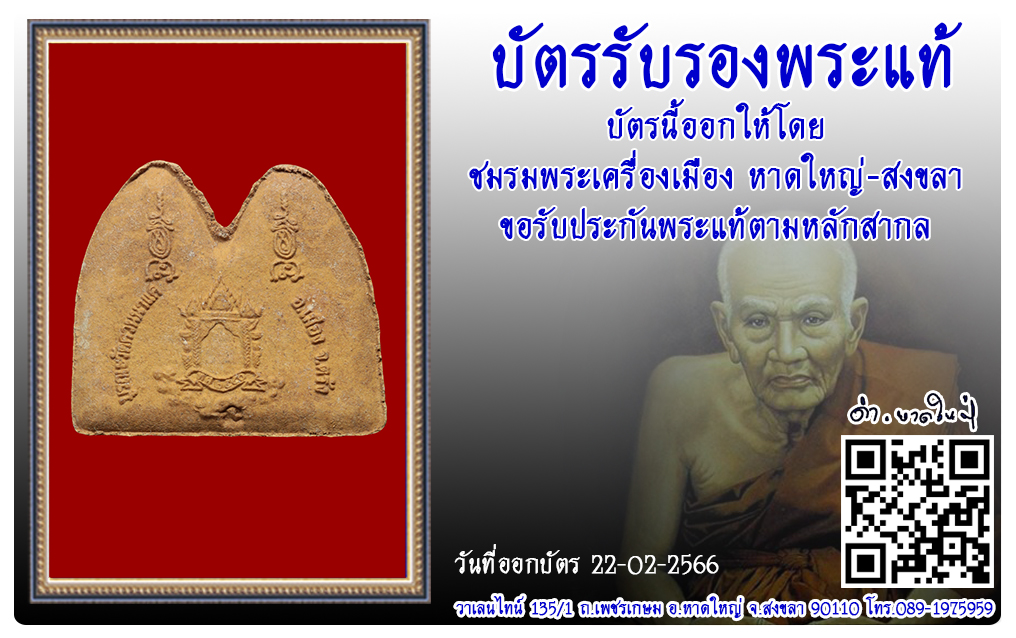 พระขุนแผนพรายคู่ วัดควนนาแค พ.ศ.2550 บัตรรับรองพระแท้ 23 ก.พ. 2023 215 share tweet share ชื่อพระ : พระขุนแผนพรายคู่ประเภท : รุ่น 2 เนื้อว่านวัด : วัดควนนาแค พ.ศ.2550รหัส : No.42551วันที่ออกบัตร : 22-02-2566