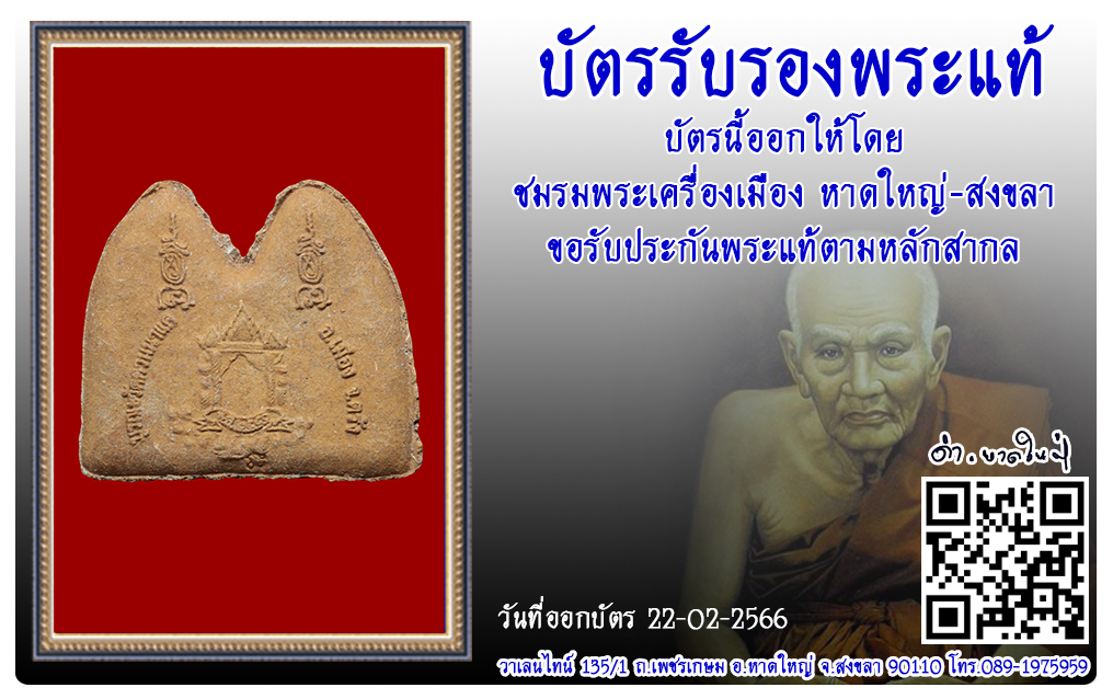 พระขุนแผนพรายคู่ วัดควนนาแค พ.ศ.2550 บัตรรับรองพระแท้ 23 ก.พ. 2023 197 share tweet share ชื่อพระ : พระขุนแผนพรายคู่ประเภท : รุ่น 2 เนื้อว่านวัด : วัดควนนาแค พ.ศ.2550รหัส : No.42552วันที่ออกบัตร : 22-02-2566