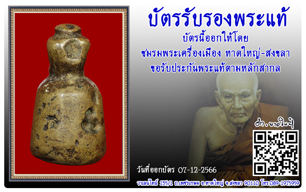 พระปิดตา ศิลป จ.พัทลุง บัตรรับรองพระแท้ 16 ธ.ค. 2023 205 share tweet share ชื่อพระ : พระปิดตาประเภท : เนื้อทองผสมวัด : ศิลป จ.พัทลุงรหัส : No.45295วันที่ออกบัตร : 07-12-2566