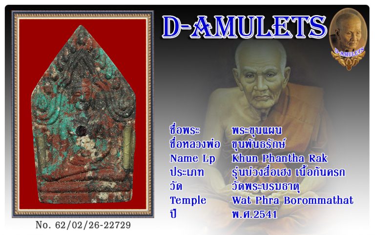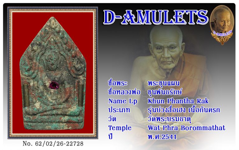 ชื่อพระ : พระขุนแผน ชื่อหลวงพ่อ ขุนพันธรักษ์ ประเภท : รุ่นบ่วงสื่อเฮง เนื้อก้นครก วัด-ปี : วัดพระบรมธาตุ พ.ศ.2541 รหัส : No.62/02/26/22730 ชื่อเจ้าของพระ Mr.Cho